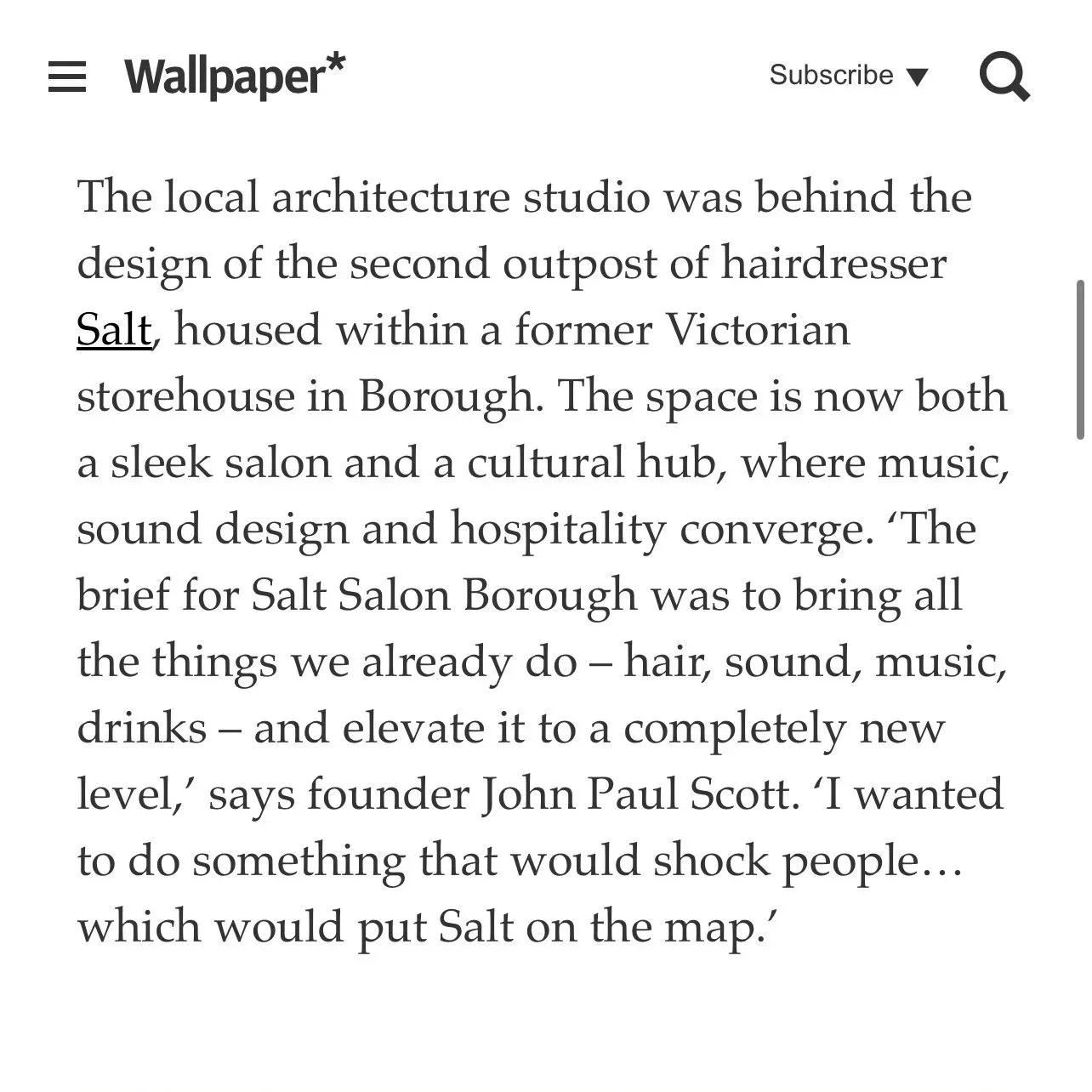 “I was recommended to SALT for a haircut and have always been nervous with letting anyone cut my curly hair. My stylist put me at ease with his knowledge of fashion and technical skill and gave me one of the best haircuts I have ever had. Looking forward to my next haircut.”